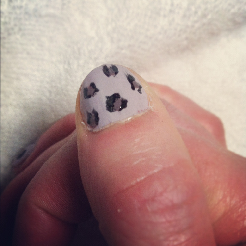 | I decided to add a little purple flare to the leopard print with Zoya polish in Kendal as the base, Confetti polish in Moostruck as the spot and Orly polish in Goth as the outline. |